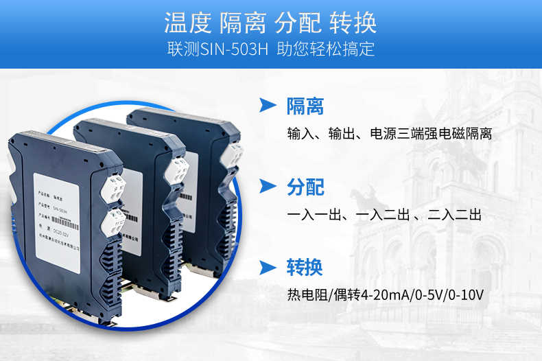 聯測溫度隔離器將PT100等熱電阻跟熱電偶信號轉換成各種電流、電壓等標準模擬量信號,可以與PC機、PLC、DCS等實現工控監測連接。抗干擾能力強,遠傳不受其他設備影響。輸入、輸出選擇范圍寬,準確度高。電源可選擇,導軌安裝便于檢測與安裝。廣泛應用于各種對溫度集中測量的監控系統中。