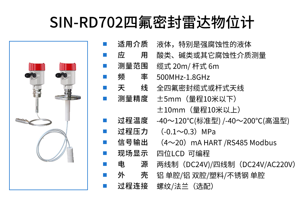聯(lián)測SIN-RD702四氟密封雷達(dá)液位計(jì),適用于強(qiáng)腐蝕性的液體。雷達(dá)液位計(jì)天線發(fā)射及窄的微波脈沖,這個(gè)脈沖以光速在空間傳播,遇到被測介質(zhì)表面,其部分能量被反射回來,被同一天線接收。發(fā)射脈沖與接收脈沖的時(shí)間間隔與天線到被測介質(zhì)表面的距離成正比,多用于水位、料位與化工場合。