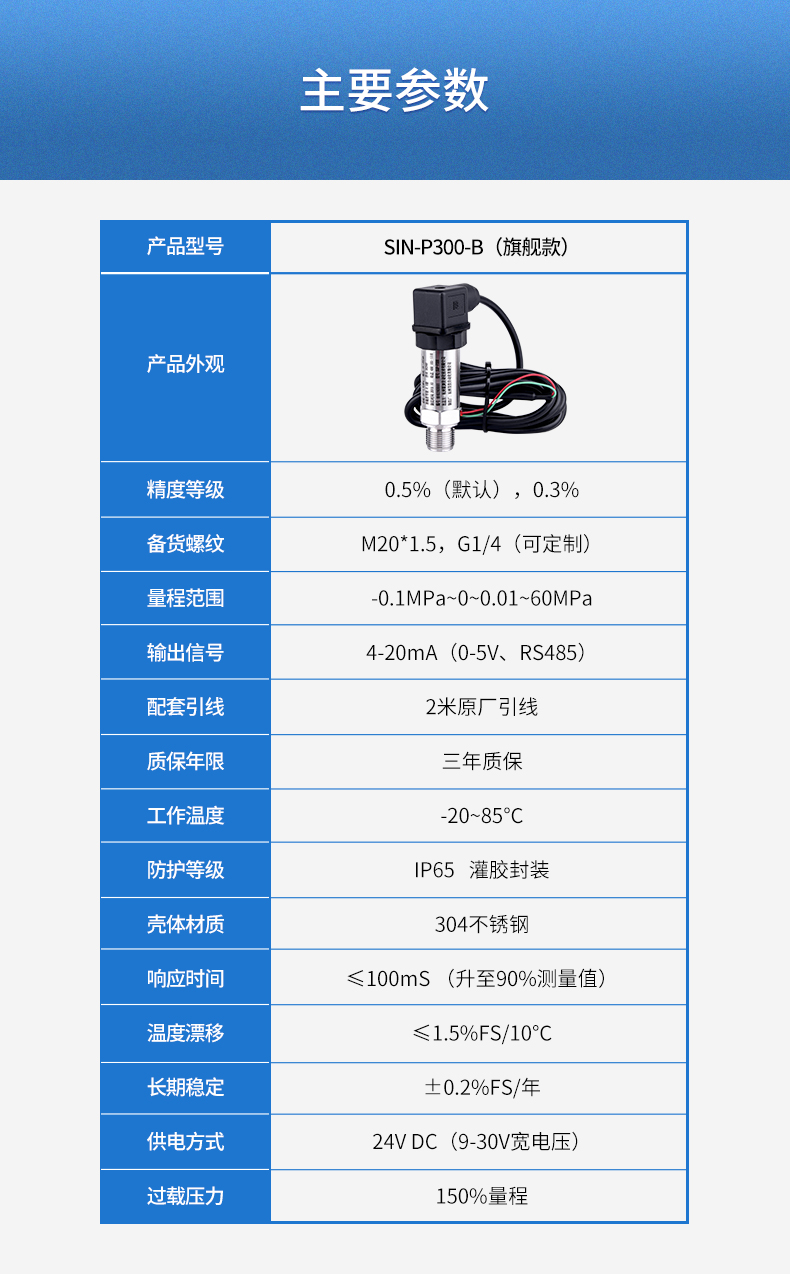 SIN-P300通用型壓力變送器德國進(jìn)口硅芯片,精度高性能穩(wěn)定;SIN-P300型通用型壓力變送器采用擴(kuò)散硅壓力芯體作為敏感元件,內(nèi)置處理電路將傳感器毫伏信號轉(zhuǎn)換成標(biāo)準(zhǔn)電壓﹑電流信號輸出,可直接與計(jì)算機(jī)、控制儀表﹑顯示儀表等相連。